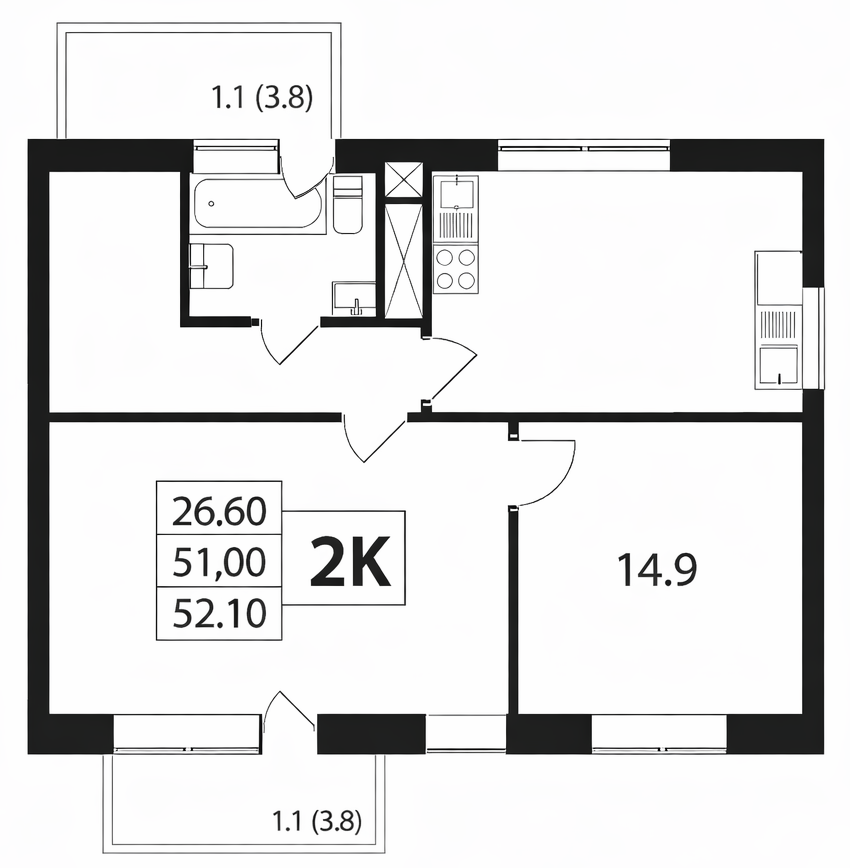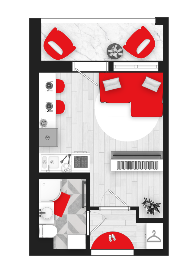 Квартира со свободной планировкой. На этом пространстве можно обустроить полноценную 1-комнатную квартиру с отдельной кухней. Под кухню застройщик предлагает отвести 7,6 «квадрата». Еще 3,3 м² остается на прихожую и 14,8 м² — под общую комнату