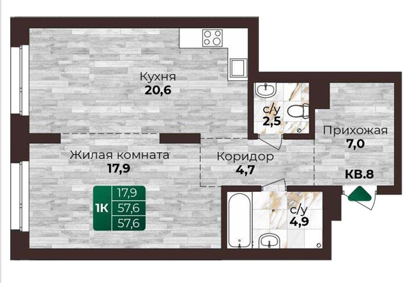 Большая квартира со свободной планировкой. Жилое помещение имеет приличную прихожую на 7 «квадратов» и два санузла. На остальном пространстве можно обустроить вместительную кухню-столовую площадью 20,6 м² и полноценную общую комнату на 17,9 м².